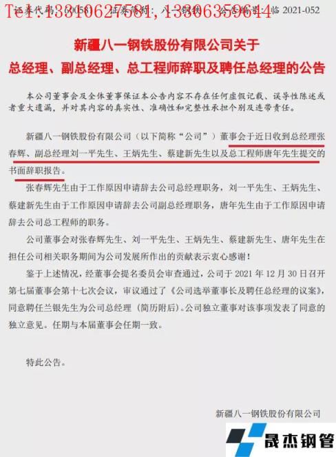 2021年12月31日,八一鋼鐵發布公告,董事會于近日收到沈東新先生辭去董事長職務,張志剛先生、姜振峰先生辭去董事職務的書面辭職報告。總經理張春輝、副總經理劉一平先生、王炳先生、蔡建新先生以及總工程師唐年先生提交書面辭職報告。