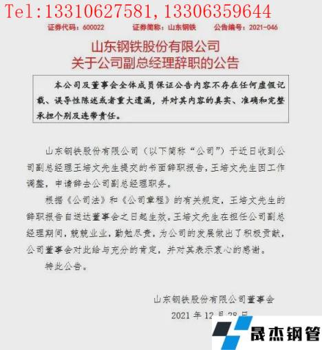 12月27日,山東鋼鐵發布公告,公司于近日收到公司副總經理王培文提交的書面辭職報告,王培文因工作調整,申請辭去公司副總經理職務。