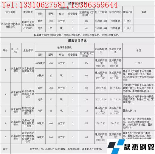 河北新金鋼鐵有限公司退出450m3高爐2座,產能104萬噸/年;40t轉爐1座,產能60萬噸/年。河北永洋特鋼集團有限公司退出450m3高爐1座,產能52萬噸/年;70t電爐1座,產能30萬噸/年。邯鄲市紫山特鋼集團有限公司退出35t電爐1座,產能13萬噸/年。武安市廣耀鑄業有限責任公司退出460m3高爐1座,產能53萬噸/年。河北新武安鋼鐵集團鑫山鋼鐵有限公司退出600m3高爐1座,產能65萬噸/年。