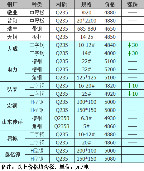 1月18日秦皇島安豐廢鋼下調(diào)20元:圓鋼頭沖豆3680模具鋼大-法蘭片、50厚上重型3660大槽鋼大H型鋼火車大梁3580,無油汽車大梁、汽車弓子3460,2厚馬碲鐵3460冷板小料3480三角矽鋼片3480不含稅。