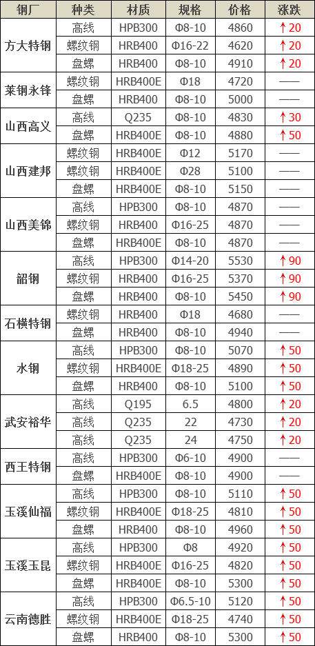 今日建材共13家鋼廠調價發布,其中: