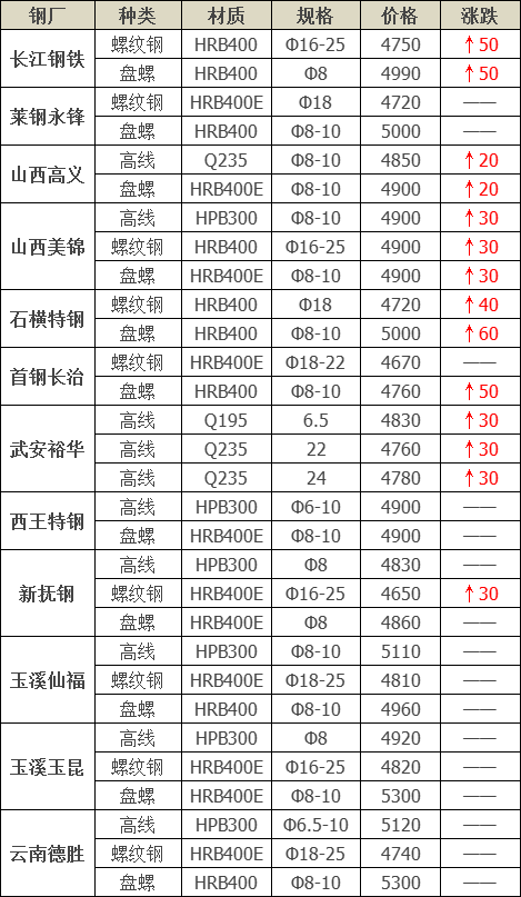 今日鋼廠指導價格穩中向上,期貨偏強震蕩?,F貨市場陸續放假休市,臨近年末,終端需求愈發清淡,價格走高商家拿貨意愿不高,成本堅挺下,廠家挺價觀望為主,預計短期鋼廠價格穩中盤整。