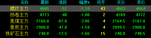 今日螺紋主力期貨跌52,收報4665,跌幅1.1%;熱卷主力跌48,收報4773,跌幅1%;焦煤主力跌87,收報2166,跌幅3.86%;焦炭主力跌47,收報2900,跌幅1.59%;鐵礦石主力跌12.5收報740,跌幅1.66%。