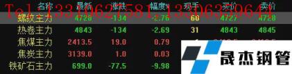 今日螺紋主力期貨跌134,收報(bào)4728,跌幅2.76%;熱卷主力跌134,收報(bào)4843,跌幅2.69%;焦煤主力漲19,收報(bào)2413.5,漲幅0.79%;焦炭主力漲1,收報(bào)3139,漲幅0.03%;鐵礦石主力跌77.5,收報(bào)699,跌幅9.98%。