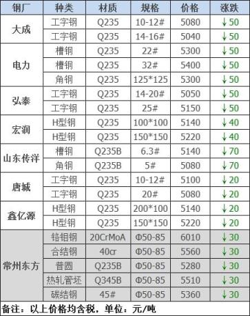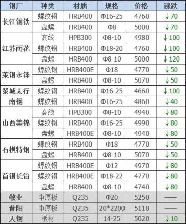 25日12:00起江陰西城刨花類(lèi)下調(diào)50-60,其他不變,調(diào)后:精爐料4000重廢3890中廢3830普通爐料3770鋼筋頭4000沖子3890-3940冷熱軋料3790-3890爐料壓塊3600鐵皮壓塊3300鋼刨花3600數(shù)控刨花3510普通刨花3420刨花壓塊3360刨花長(zhǎng)絲3310含稅單位:元/噸。