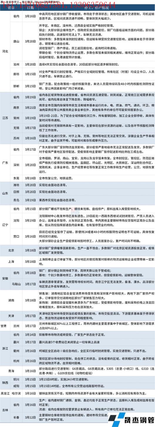好像是一夜之間,疫情再次卷土重來(lái)。截至3月21日,16個(gè)省份停工復(fù)工情況見(jiàn)下表。其中,3月21日,南京全市范圍內(nèi)除保障市民生活和城市基本運(yùn)行的水、電、燃油、燃?xì)狻⑼ㄐ拧h(huán)衛(wèi)、糧油肉菜供應(yīng)等公共服務(wù)類企事業(yè)單位外,其他有條件的單位盡可能安排居家辦公。3月20日,唐山開(kāi)平區(qū)、豐南區(qū)、灤州市、遷西縣全域?qū)嵤﹪?yán)格封控管理;大部分鋼企維持生產(chǎn),但政府實(shí)施道路管控,無(wú)縫鋼管廠家均面臨運(yùn)輸方面的問(wèn)題。深圳全市福田、羅湖、南山、寶安、龍崗以及龍華暫未恢復(fù),全市封控區(qū)、管控區(qū)、防范區(qū)繼續(xù)嚴(yán)格執(zhí)行疫情防控相關(guān)措施。山東濰坊、日照、青島萊西市實(shí)現(xiàn)社會(huì)面動(dòng)態(tài)清零。河北滄州連續(xù)4天實(shí)現(xiàn)社會(huì)面動(dòng)態(tài)清零,3月20日起部分地區(qū)逐步解除封控。
