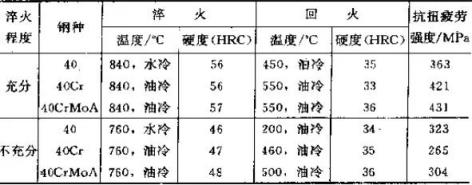 用40鋼、40Cr鋼和40CrMoA鋼加工成兩組疲勞試樣,第一組式樣在840℃正常淬火溫度下加熱淬火,硬度為56~57HRC,第二組用760℃淬火,淬火不充分,淬火硬度只能達到46~48HRC,將兩組式樣經過不同溫度回火至相同硬度(均為33~36HRC)然后進行疲勞試驗,試驗結果列于表1.實驗表明,淬火不充分的第二組試樣的抗扭疲勞強度比充分淬火的第一組試樣的抗扭疲勞強度低10.8%~37%。