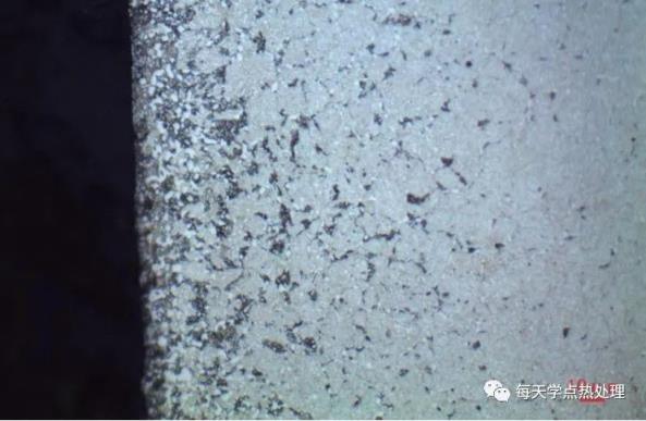將碳氮共滲中工件的橫截面拋光后,在未腐蝕或輕微腐蝕的狀態下,使用光學顯微鏡在表面滲層中有時可觀察到一些分散的大小不一的黑色或暗灰色的斑點、黑帶和黑網,這些深色的斑點、黑帶和黑網,統稱為黑色組織。黑色組織的深度一般不超過0.05mm。深色的斑點是一些主要沿奧氏體晶界分布的大小不一的孔洞。黑色帶通常出現在距表面0.03mm深度內,黑帶的內測往往可觀察到黑色網,主要由于表層形成了某些合金元素的碳氧化物、氮氧化物和碳化物等小顆粒,使奧氏體中合金元素貧化,導致淬透性降低而形成了托氏體的結果。碳氮共滲的黑色組織類似于氣體滲碳的內氧化,使表面硬度下降,有益的殘余壓應力減小,或表面形成殘余拉應力,導致疲勞強度的降低。20Cr2Ni4A鋼碳氮共滲試樣表面黑色組織可使彎曲疲勞強度降低約6%。