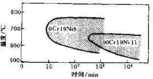 然而在某個特定溫度區間和時間參數下進行熱處理或在某個溫度區間長期使用時,由于含鉻碳化物沿晶界析出將導致晶界腐蝕抗力的急劇下降。表示發生晶界腐蝕的熱處理溫度和時間關系曲線叫做時間-溫度-敏化曲線(T-T-S曲線)。圖6 就是奧氏體不銹鋼的典型T-T-S曲線。在C型曲線的右側熱處理狀態下,不銹鋼易產生晶間腐蝕。
