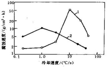 ▲圖7冷卻速度對1Cr17不銹鋼腐蝕速率的影響1-空冷(從1200℃冷卻) 2-空冷(從950℃冷卻)
