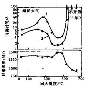 強度強烈地影響馬氏體不銹鋼的應力腐蝕開裂行為。淬火狀態下其應力腐蝕開裂的傾向很大,隨著回火溫度的升高,應力腐蝕抗力顯著得到改善,但是對于Cr12型馬氏體不銹鋼,在400-550℃溫度區間回火時,由于M23C6型碳化物的析出造成基體局部貧鉻,會出現應力腐蝕抗力低谷。見圖10 。