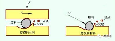 1磨料磨損外界硬顆?;蛘邔?duì)磨表面上的硬突起物或粗糙峰在摩擦過程中引起表面材料脫落的現(xiàn)象, 稱為磨粒磨損(又稱磨料磨損)。磨粒是摩擦表面互相摩擦產(chǎn)生或由介質(zhì)帶入摩擦表面。
