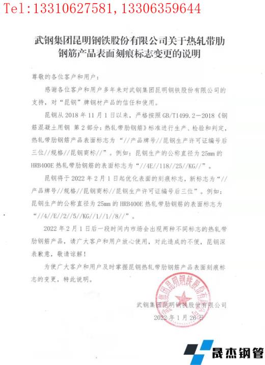 為使廣大客戶和用戶及時掌握昆鋼熱軋帶肋鋼筋產品表面刻痕標志的變更,特此說明。