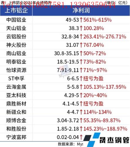 免責聲明:本網站(山東聊城晟杰無縫鋼管廠www.centurybiz.cn)刊載的“15家上市鋁企2021年業績飄紅,神火股份大增超7倍”等均源于網絡,版權歸原作者所有,且僅代表原作者觀點,本文所載信息僅供參考。轉載僅為學習與交流之目的,如無意中侵犯您的合法權益,請及時聯系刪除。本網站刊登此篇文章并不意味著本站贊同其觀點或證實其內容的真實性,我們不對其科學性、嚴肅性等作任何形式的保證。如果侵犯了您的版權,請盡快聯系我們予以撤銷,謝謝合作!