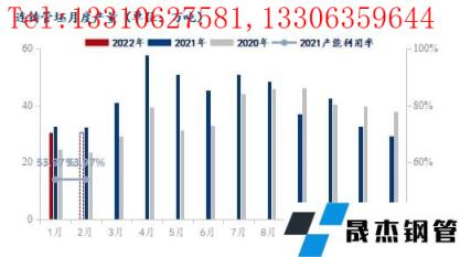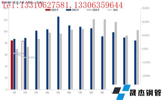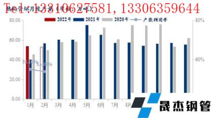 2、2022年2月管坯無縫厚壁鋼管廠家計劃排產(chǎn)83.5萬噸,較1月份實際產(chǎn)量減少1.1萬噸,2月份計劃產(chǎn)能利用率為53.98%,較1月實際產(chǎn)能利用率減少0.71%;