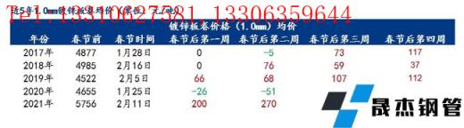 重慶鍍鋅:市場仍處于休市狀態,多數貿易商暫未開工。重慶1.0*1250*C有花鍍鋅板卷主流無縫厚壁鋼管廠家報價5600元/噸,較節前并未有變化。由于本地無縫厚壁鋼管廠家檢修,無縫厚壁鋼管廠家資源投放量有所減量,春節期間預估增加2000噸。貿易商整體庫存壓力尚可承受,對于節后行情信心較足。