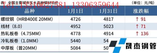 1月國內(nèi)厚壁無縫鋼管市場整體呈現(xiàn)了震蕩偏強走勢,而板材價格分化明顯,螺紋鋼修復性反彈近百元,熱軋板卷上漲了136元,但中厚板表現(xiàn)趨弱。原料方面價格漲幅強于預期,1月在無縫厚壁鋼管廠家復產(chǎn)和節(jié)前補庫需求支撐下,鐵礦石價格持續(xù)上漲,62%澳洲粉礦港口現(xiàn)貨價格指數(shù)960.0元/濕噸,環(huán)比月初上漲158.0元/濕噸,漲幅19.7%。整體來看,宏觀消息面利好,厚壁無縫鋼管供應快速下滑,導致庫存累積幅度不及預期,而需求結(jié)束較晚,使得鋼價走強。