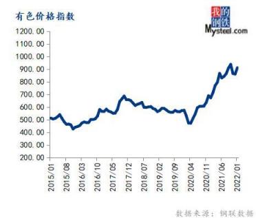 1月份有色價(jià)格指數(shù)為910.93,環(huán)比上漲5.88%,同比上漲35.47%。
