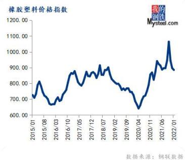 1月份橡膠塑料價(jià)格指數(shù)為885.45,環(huán)比下跌1.29%,同比上漲7.55%。