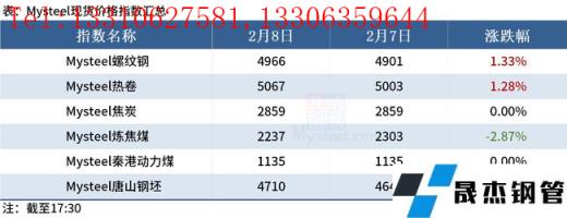 ◎ 2月8日下午,對(duì)山東、山西、河南三省43家無縫厚壁鋼管廠家限產(chǎn)狀態(tài)進(jìn)行更新,涉及生鐵年產(chǎn)能1.58億。據(jù)調(diào)研了解,目前43家無縫厚壁鋼管廠家高爐產(chǎn)能利用率為75.31%,日均生鐵產(chǎn)量33萬噸。為保證冬奧會(huì)期間北京的空氣質(zhì)量,預(yù)計(jì)未來三天內(nèi)區(qū)域內(nèi)將有11家無縫厚壁鋼管廠家的的燒結(jié)、高爐生產(chǎn)有所調(diào)整,調(diào)整期間影響日均鐵水產(chǎn)量4.56萬噸/日。