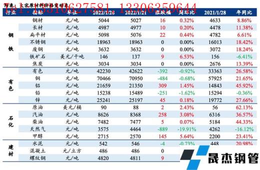 免責聲明:本網站(山東聊城晟杰無縫鋼管廠www.centurybiz.cn)刊載的“大宗原材料價格周報(1.24-1.28)”等均源于網絡,版權歸原作者所有,且僅代表原作者觀點,本文所載信息僅供參考。轉載僅為學習與交流之目的,如無意中侵犯您的合法權益,請及時聯系刪除。本網站刊登此篇文章并不意味著本站贊同其觀點或證實其內容的真實性,我們不對其科學性、嚴肅性等作任何形式的保證。如果侵犯了您的版權,請盡快聯系我們予以撤銷,謝謝合作!