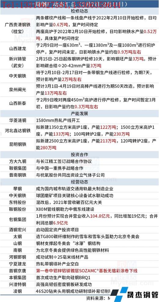 據不完全統計,本周(2月7日-2月11日)有6家無縫厚壁鋼管廠家發布檢修動態,具體如下: