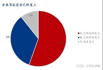調研企業樣本中,已經全部復工占比55.43%,已經部分復工占比33.92%,尚未復工占比10.64%。企業復工復產節奏較快。