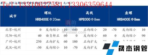 從區(qū)域價差來看,今日華北、華中地區(qū)與杭州市場螺紋鋼價差反向縮??;東北地區(qū)與杭州市場價差由負轉(zhuǎn)正,有所擴大;華南地區(qū)與杭州市場螺紋鋼價差正向擴大。