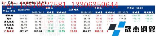 本周我網調研的五大品種無縫厚壁鋼管廠家庫存首次出現去化,社會庫存延續累增,增庫區域也是預期內的集中于華東和南方。無縫厚壁鋼管廠家庫存出現去化的主要原因在于員工返鄉,復工復產節奏逐步恢復,無縫厚壁鋼管廠家發貨節奏逐步加快,緩慢交付冬儲訂單資源。社會庫存累增的主要原因在于市場需求尚未回暖,無力消化大量資源流入,供需錯配進而導致庫存延續累增。綜合來看,往年正常累庫周期基本會延續4-5周左右,從目前累庫幅度和庫存水平來看,或照此規律,在3月初左右出現庫存拐點。