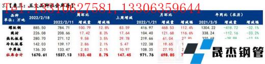 庫存方面,五大品種厚壁無縫鋼管總庫存春節后連續累增三周,環比上周增加110.41萬噸,增幅5.0%。分品種看,建材庫存增加100.78萬噸,增幅為7.0%;板材庫存增加9.63萬噸,增幅1.3%。;分指標看,無縫厚壁鋼管廠家庫存環比減少23.07萬噸,降幅3.5%;社會庫存環比增加133.48萬噸,增幅8.7%。