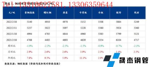 本周普鋼價格指數小幅下跌。截至2月18日,普鋼價格指數報5140點,環比跌1.9%;螺紋鋼報4910元/噸,環比上周跌2.2%元/噸。本周厚壁無縫鋼管價格結束上漲出現回落,原因在于驅動價格上漲的邏輯出現變化。