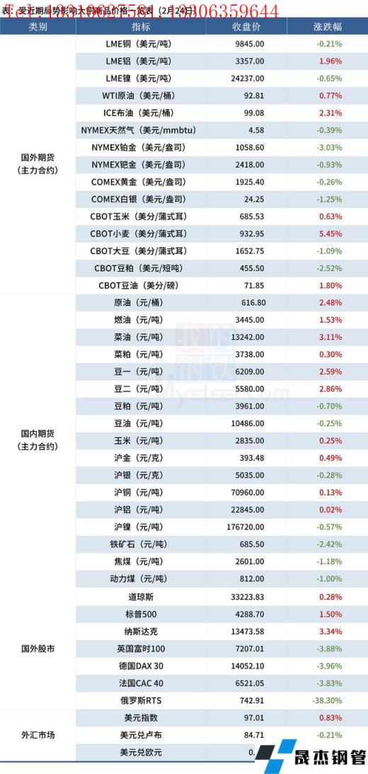 免責聲明:本網站(山東聊城晟杰無縫鋼管廠www.centurybiz.cn)刊載的“受近期局勢影響大宗商品價格一覽表(2月24日)”等均源于網絡,版權歸原作者所有,且僅代表原作者觀點,本文所載信息僅供參考。轉載僅為學習與交流之目的,如無意中侵犯您的合法權益,請及時聯系刪除。本網站刊登此篇文章并不意味著本站贊同其觀點或證實其內容的真實性,我們不對其科學性、嚴肅性等作任何形式的保證。如果侵犯了您的版權,請盡快聯系我們予以撤銷,謝謝合作!
