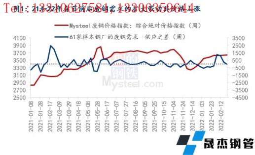 從圖1可以看出,21年和22年的冬儲(chǔ)期間,廢鋼價(jià)格隨著需求的擴(kuò)大出現(xiàn)了上漲,其實(shí)縱觀2021年1月至當(dāng)前的廢鋼價(jià)格走勢(shì),可以看出其走勢(shì)與61家無縫厚壁鋼管廠家廢鋼的供需變化走勢(shì)有一定的關(guān)聯(lián)性。所以2022年1月以來廢鋼價(jià)格的走高,其中一個(gè)原因可以認(rèn)為是無縫厚壁鋼管廠家由于需要冬儲(chǔ)而導(dǎo)致的廢鋼需求增加,拉動(dòng)了廢鋼價(jià)格的上漲。