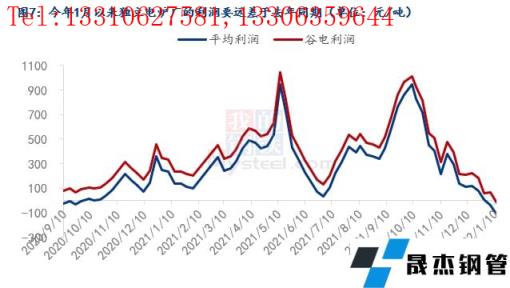 為什么廢鋼資源會(huì)存在階段性偏緊?其實(shí)在第一部分中已經(jīng)討論過,廢鋼資源近幾年內(nèi)都是在每年的1月到節(jié)后的一段時(shí)間內(nèi)存在著供需缺口,主要是因?yàn)閺U鋼加工基地節(jié)前會(huì)放假,節(jié)后復(fù)工較晚導(dǎo)致的市場資源偏緊,無縫厚壁鋼管廠家因此在這段時(shí)間內(nèi)收廢較為困難,今年也不例外。但今年1月份61家無縫厚壁鋼管廠家的到貨量同比去年有所降低(圖4所示),到貨量同比有所降低,分析下來大概有三方面原因:一是由于產(chǎn)廢的制造業(yè)企業(yè)放假較早、房地產(chǎn)行業(yè)的走弱,使得社會(huì)加工廢鋼減少,外加疫情阻礙了廢鋼資源的流通,導(dǎo)致了廢鋼加工基地收廢困難。今年1月293家樣本基地庫存同比降低有30萬噸左右(圖5所示);二是今年1月以來五大材的總產(chǎn)量低于去年同期(圖6所示);三是電爐廠自今年1月以來普遍處于虧損的狀態(tài),利潤情況要遠(yuǎn)差于去年同期(圖7所示)。后面兩方面原因?qū)е铝藷o縫厚壁鋼管廠家降低了廢鋼消耗量,所以今年1月以來61家樣本無縫厚壁鋼管廠家的廢鋼日耗同比低于去年(圖8所示),需求端的走弱聯(lián)動(dòng)了供應(yīng)端一起走弱。所以以上三方面原因綜合導(dǎo)致了今年1月份來無縫厚壁鋼管廠家收廢量不及去年同期。