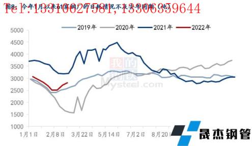 今年1月以來,統(tǒng)計(jì)的61家樣本無縫厚壁鋼管廠家日均到貨量為2650噸,同比去年的3288噸下降了638噸。有三方面的原因:一是由于節(jié)前產(chǎn)廢的制造業(yè)企業(yè)放假較早、房地產(chǎn)行業(yè)的走弱,使得社會(huì)加工廢鋼減少,外加疫情阻礙了廢鋼資源的流通,導(dǎo)致了廢鋼加工基地收廢困難;二是今年1月以來五大材的總產(chǎn)量低于去年同期;三是電爐企業(yè)自今年1月以來普遍處于虧損的狀態(tài),利潤情況要遠(yuǎn)差于去年同期。后面兩方面原因?qū)е铝藷o縫厚壁鋼管廠家降低了用廢量,所以今年1月以來61家樣本無縫厚壁鋼管廠家的廢鋼日耗同比低于去年,需求端的走弱聯(lián)動(dòng)了供應(yīng)端一同走弱。以上三方面原因綜合導(dǎo)致了今年1月以來廢鋼的供應(yīng)量不及去年同期。