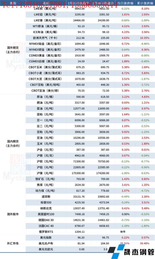 免責聲明:本網站(山東聊城晟杰無縫鋼管廠www.centurybiz.cn)刊載的“受近期局勢影響大宗商品價格一覽表(2月28日)”等均源于網絡,版權歸原作者所有,且僅代表原作者觀點,本文所載信息僅供參考。轉載僅為學習與交流之目的,如無意中侵犯您的合法權益,請及時聯系刪除。本網站刊登此篇文章并不意味著本站贊同其觀點或證實其內容的真實性,我們不對其科學性、嚴肅性等作任何形式的保證。如果侵犯了您的版權,請盡快聯系我們予以撤銷,謝謝合作!