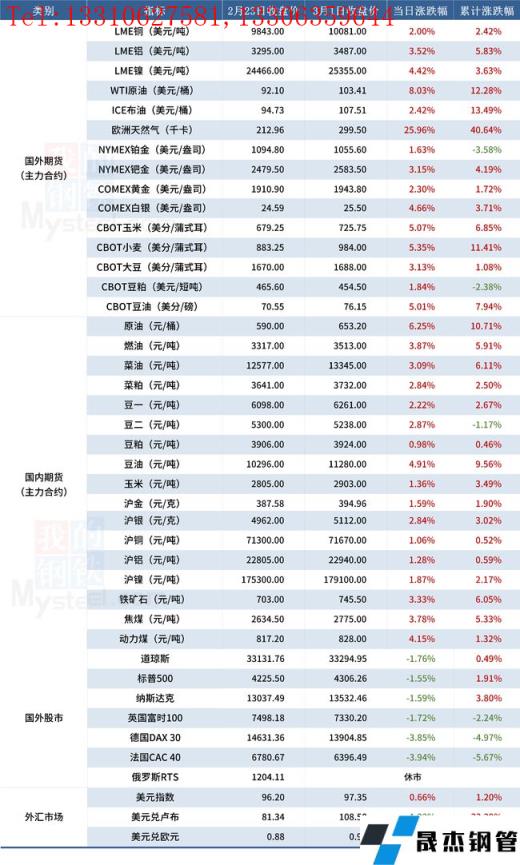 免責聲明:本網站(山東聊城晟杰無縫鋼管廠www.centurybiz.cn)刊載的“受近期局勢影響大宗商品價格一覽表(3月1日)”等均源于網絡,版權歸原作者所有,且僅代表原作者觀點,本文所載信息僅供參考。轉載僅為學習與交流之目的,如無意中侵犯您的合法權益,請及時聯系刪除。本網站刊登此篇文章并不意味著本站贊同其觀點或證實其內容的真實性,我們不對其科學性、嚴肅性等作任何形式的保證。如果侵犯了您的版權,請盡快聯系我們予以撤銷,謝謝合作!