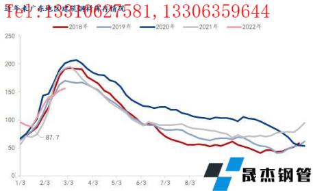 庫存方面,截止2月28日,根據(jù)廣州建材倉庫同口徑統(tǒng)計(jì),建筑厚壁無縫鋼管總庫存156.1萬噸,周環(huán)比增加3.92萬噸,連續(xù)6周回升。其中螺紋鋼庫存92.7萬噸,周環(huán)比增加5.06萬噸;線材63.4萬噸,周環(huán)比減少1.14萬噸。近年來春節(jié)后廣東省庫存量均呈現(xiàn)增加態(tài)勢,其中2020年節(jié)后庫存總量最高;據(jù)調(diào)研,節(jié)后廣東建筑厚壁無縫鋼管庫存峰值均出現(xiàn)第3-5周,累庫周期約24天左右;雖然2022年節(jié)前價(jià)格偏高,但節(jié)前現(xiàn)貨價(jià)格上漲,帶動(dòng)市場不少商家主動(dòng)性囤貨、備貨,節(jié)前庫存總量并未出現(xiàn)明顯累庫現(xiàn)象。節(jié)后開市,在疫情等因素影響下,累庫速度遠(yuǎn)低于往年,因此預(yù)計(jì)短期庫存仍有增加的可能,但峰值難超去年,且最近2-3周可能會(huì)迎來庫存拐點(diǎn)。
