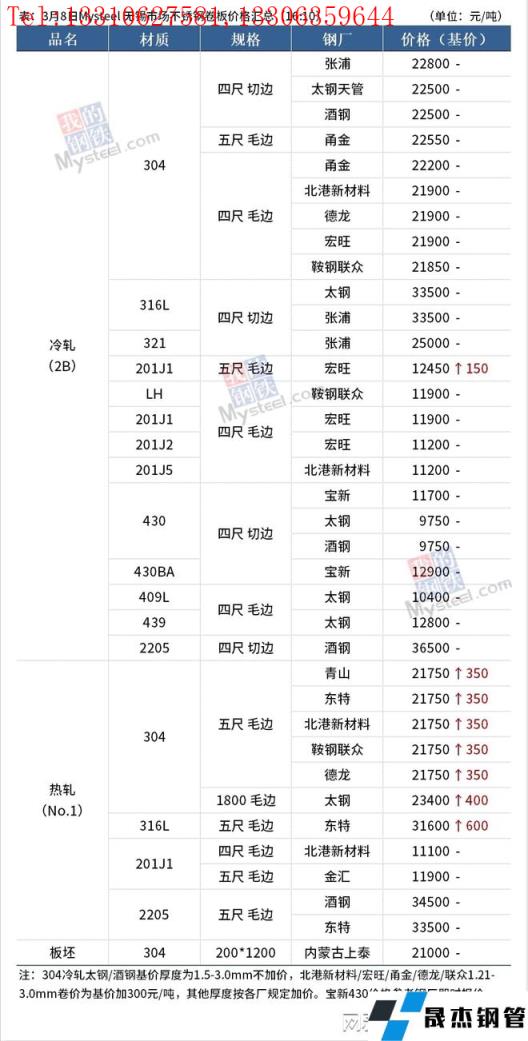 3月8日無錫市場(chǎng)300系價(jià)格偏強(qiáng)運(yùn)行,日內(nèi)民營冷熱軋價(jià)格漲幅1550-1600元/噸,截至下午四點(diǎn),民營304冷軋主流價(jià)格至21900-22000元/噸毛基,民營熱軋資源五尺毛邊主流價(jià)格至21650-21950元/噸;200系價(jià)格偏強(qiáng)運(yùn)行,日內(nèi)冷熱軋有400元/噸左右的上漲,截至下午四點(diǎn),無錫市場(chǎng)201J2/J5四尺冷軋價(jià)格主流成交在11200-11300元/噸毛基,五尺熱軋主流成交在11900-12000元/噸;400系價(jià)格穩(wěn)中偏強(qiáng)運(yùn)行,目前太鋼、酒鋼430冷軋切邊主流價(jià)格9750-9900元/噸。