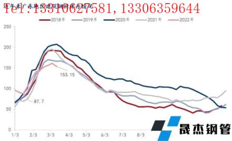對比歷史數據來看,近10年來春節后廣州建筑厚壁無縫鋼管庫存峰值均出現第3-5周,累庫周期約24天左右;近5年來節后庫存累庫量明顯上升,節后峰值水平均超過150萬噸以上,而2017年之前節后庫存峰值均在140萬噸以內。近年來,隨著經濟發展以及供應擴張,春節前市場主動性冬儲積極性增加,整體的庫存量出現明顯上升; 雖然2022年節前價格偏高,但節前現貨價格上漲,帶動市場不少商家主動性囤貨、備貨,節前庫存總量并未出現明顯累庫現象。節后開市,在疫情等因素影響下,累庫速度遠低于去年,今年庫存呈現的特點是,累庫速度快,累庫量大,周期短等特點。同時再加上今年節后不少短流程企業并未完全恢復生產,自然資源供應量有所減量,節后累庫低于往年,且今年峰值出現在3月第1周,第二周迎來庫存拐點。