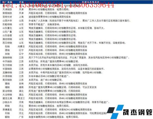 經(jīng)調(diào)研國(guó)內(nèi)多數(shù)優(yōu)特鋼無(wú)縫厚壁鋼管廠家物流出貨有受疫情影響,主要在于對(duì)提貨人員著明確規(guī)范要求:各門(mén)崗卡口強(qiáng)化查驗(yàn)健康碼、行程卡和48小時(shí)核酸檢測(cè)報(bào)告,并做好人員信息登記。目前受影響各無(wú)縫厚壁鋼管廠家詳細(xì)提貨及影響運(yùn)輸要求見(jiàn)下表明細(xì)。后期政策變動(dòng)情況,請(qǐng)具體咨詢(xún)當(dāng)?shù)責(zé)o縫厚壁鋼管廠家。