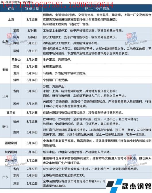 近期,全國疫情呈現(xiàn)局部高度聚集和多點散發(fā)態(tài)勢,對國內(nèi)大宗商品市場的供應(yīng)端、需求端、物流及倉儲等方面都有不同程度的影響。據(jù)統(tǒng)計,截至3月15日,全國多個省市發(fā)布停工停產(chǎn)情況。其中受疫情影響最大的吉林省于3月12日宣布,長春市主要厚壁無縫鋼管倉庫暫停出庫,當?shù)亟ú氖袌鼋煌哆M入暫時停滯狀態(tài),倉庫入庫及本地無縫厚壁鋼管廠家生產(chǎn)暫時正常。深圳市于3月12日宣布,全市范圍內(nèi)所有建設(shè)工地暫定停工排查4天,南山及福田區(qū)域厚壁無縫鋼管市場預計共影響需求量約6640噸。與此同時,全國其他地區(qū)鋼貿(mào)交易也受到影響,部分工地開始停工,物流運輸暫停服務(wù)。具體情況如下: