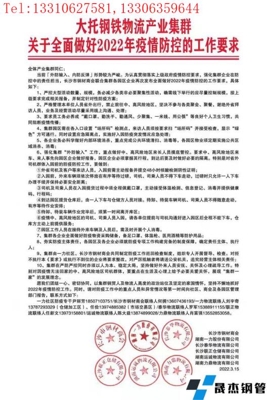 繼3月14日長沙新增1例外省輸入新冠病毒核酸檢測初篩陽性后,相關部門已立即采取應急處置措施。據小編了解,為認真貫徹上級政府疫情防控要求,本地鋼鐵生產企業加強防控,層層核實人員情況,目前生產供應情況一切正常。厚壁無縫鋼管市場交易活動有序進行,暫無工地受此影響停工。為防患于未然,長沙市厚壁無縫鋼管商會聯合集群各園區企業再次發布全面做好2022年疫情防控的工作要求,具體情況如下: