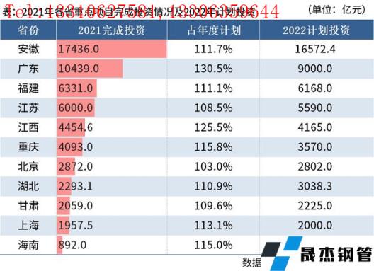 據(jù)不完全統(tǒng)計(jì),截至3月16日,已有11個(gè)省份公布其2021年重點(diǎn)項(xiàng)目完成投資情況。根據(jù)地方政府公開(kāi)資料顯示,11個(gè)省份2021年重點(diǎn)項(xiàng)目共完成投資近5.9萬(wàn)億元,且均超過(guò)當(dāng)年計(jì)劃目標(biāo)。2022年,上述11省份共計(jì)劃投資近5.6萬(wàn)億元,其中安徽省計(jì)劃投資超1.65萬(wàn)億,排名第一。