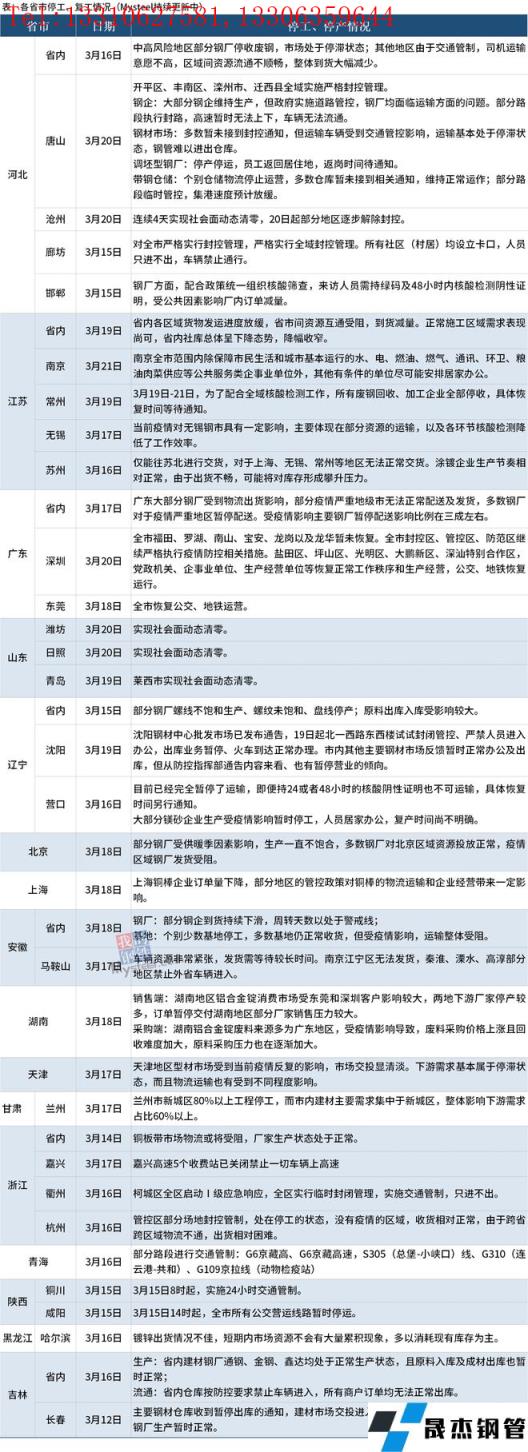 截至3月21日,匯總了16個(gè)省份停工停產(chǎn)最新信息。其中,3月21日,南京全市范圍內(nèi)除保障市民生活和城市基本運(yùn)行的水、電、燃油、燃?xì)狻⑼ㄓ崱h(huán)衛(wèi)、糧油肉菜供應(yīng)等公共服務(wù)類企事業(yè)單位外,其他有條件的單位盡可能安排居家辦公。3 月20日,唐山開(kāi)平區(qū)、豐南區(qū)、灤州市、遷西縣全域?qū)嵤﹪?yán)格封控管理;大部分鋼企維持生產(chǎn),但政府實(shí)施道路管控,無(wú)縫厚壁鋼管廠家均面臨運(yùn)輸方面的問(wèn)題。深圳全市福田、羅湖、南山、寶安、龍崗以及龍華暫未恢復(fù),全市封控區(qū)、管控區(qū)、防范區(qū)繼續(xù)嚴(yán)格執(zhí)行疫情防控相關(guān)措施。山東濰坊日照、青島萊西市實(shí)現(xiàn)社會(huì)面動(dòng)態(tài)清零。河北滄州連續(xù)4天實(shí)現(xiàn)社會(huì)面動(dòng)態(tài)清零,3月20日起部分地區(qū)逐步解除封控。具體情況如下: