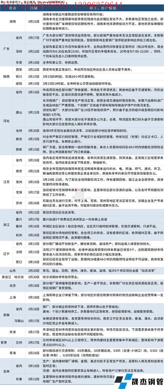 截至3月22日,匯總了16個省份停工復工最新信息。其中,湖南省本地鋼企對廢鋼送貨車輛管控有所升級;主流廢鋼基地疫情管控措施與此前相比變化不大,多數基地正常加工出貨,部分基地對進廠車輛管控較前期有所升。唐山長流程無縫厚壁鋼管廠家目前整體生產情況正常,但受全域交通臨時管控影響,依靠汽運原料進廠及成品材出廠嚴重受阻,個別無縫厚壁鋼管廠家已有由于原料短缺導致高爐停產的情況發生。山東省已有青島、煙臺、日照、德州、濰坊、威海、淄博、臨沂8個市實現社會面“動態清零”。具體情況如下: