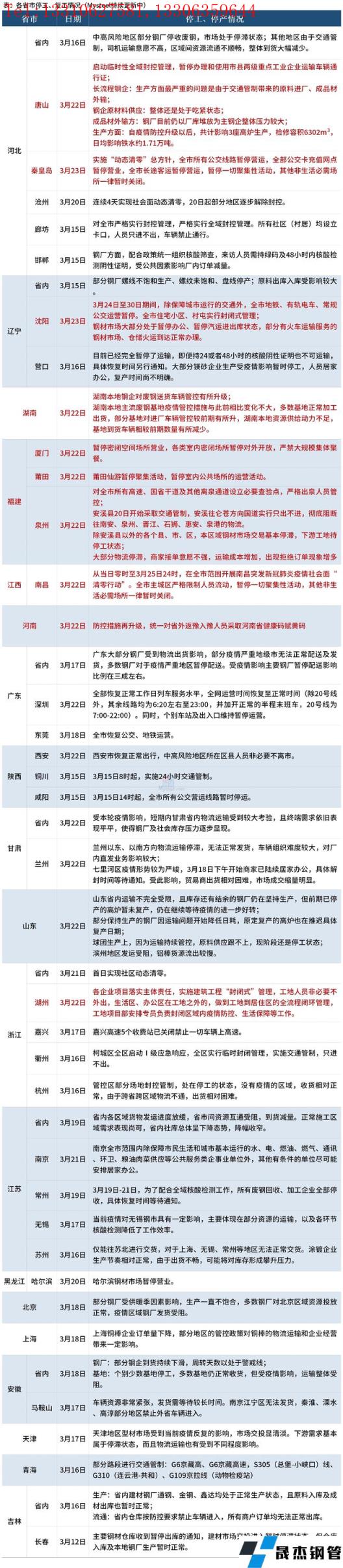 其中,3月22日,唐山市啟動臨時性全域封控管理,暫停辦理和使用市縣兩級重點工業(yè)企業(yè)運輸車輛通行證。沈陽于3月24日至30日期間,除保障城市運行的交通外,全市地鐵、有軌電車、常規(guī)公交運營暫停,全市住宅小區(qū)、村屯實行封閉式管理;厚壁無縫鋼管市場大部分處于暫停辦公、暫停汽運進出庫狀態(tài),部分有火車運輸服務(wù)的厚壁無縫鋼管市場、倉儲火運到達正常辦理。3月20日福建泉州安溪縣開始采取交通管制,除安溪縣以外的各個縣、市、區(qū),本區(qū)域厚壁無縫鋼管市場交易基本停滯,下游工地待停工狀態(tài)。具體情況如下: