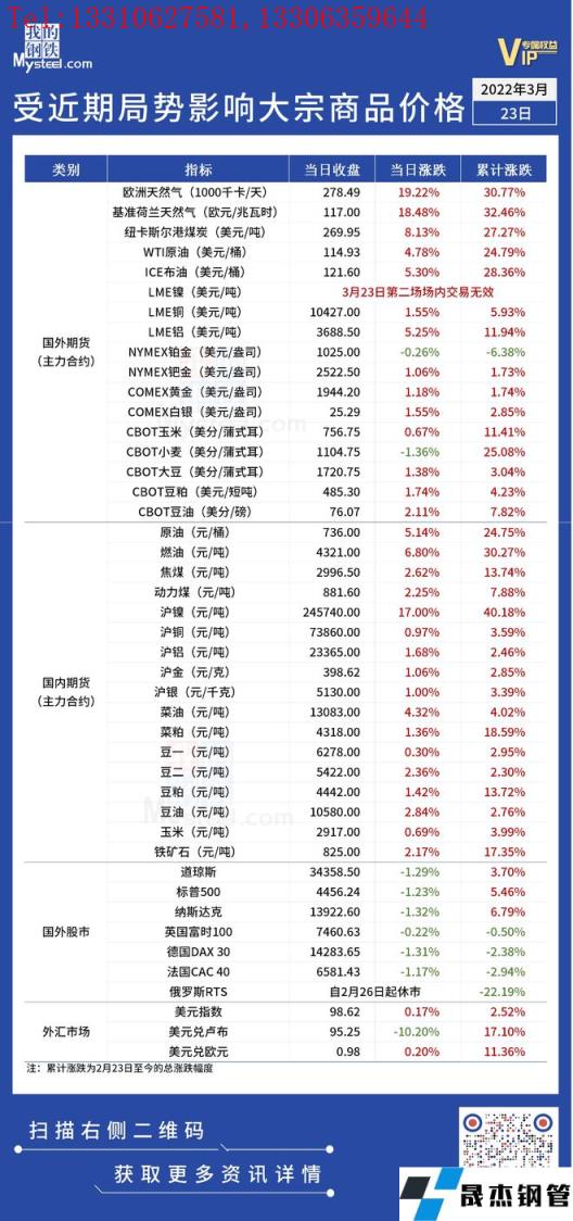 近期,受國(guó)際局勢(shì)影響,全球金融及大宗商品市場(chǎng)出現(xiàn)較大波動(dòng)。3月23日,國(guó)際油價(jià)、能源價(jià)格大漲,倫敦金屬交易所(LME)表示,3月23日鎳的第二場(chǎng)場(chǎng)內(nèi)交易將被視為受到干擾,該交易期間達(dá)成的所有交易將無(wú)效。匯總情況如下: