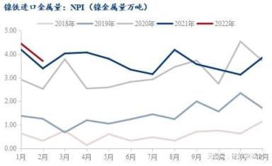 縱觀歷年來(lái)的中國(guó)鎳鐵進(jìn)口數(shù)據(jù),2月進(jìn)口量均會(huì)存在環(huán)比下降的情況。今年2月環(huán)比減量高達(dá)20%,除了1月進(jìn)口量太多,主因還是2月自然天數(shù)較少。雖然印尼鎳生鐵冶煉企業(yè)春節(jié)正常生產(chǎn),但國(guó)內(nèi)印尼鎳鐵進(jìn)口貿(mào)易多處于假期狀態(tài),月內(nèi)進(jìn)口量也隨之降低。