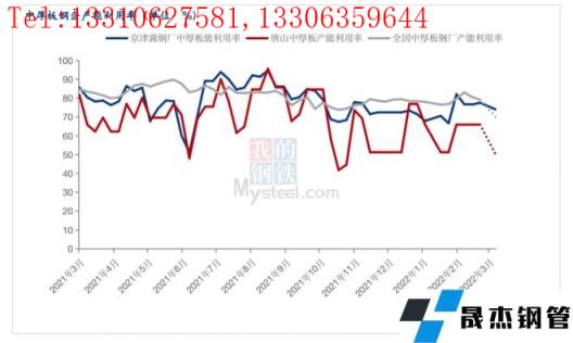 由于前期京津冀地區(qū)受到“2+26”座城市秋冬季限產(chǎn)、冬殘奧會(huì)限產(chǎn)等政策,產(chǎn)能利用率出現(xiàn)了明顯的下滑。隨著采暖季的結(jié)束以及東殘奧會(huì)的閉幕,鋼企的產(chǎn)能利用率出現(xiàn)了回升,截至3月18日,全國(guó)中厚板鋼企產(chǎn)能利用率79.13%,京津冀地區(qū)中厚板鋼企產(chǎn)能利用率77.55%,唐山地區(qū)中厚板鋼企產(chǎn)能利用率為65.53%,隨著3月19日唐山疫情突發(fā),無(wú)縫厚壁鋼管廠(chǎng)家的復(fù)產(chǎn)節(jié)奏與物流均受到了影響,當(dāng)下原料供給是當(dāng)下比較棘手的問(wèn)題,短期內(nèi)爐料補(bǔ)給不足,鋼企被迫停產(chǎn)的可能性較大。預(yù)計(jì)3月底,唐山中厚板產(chǎn)能利用率或?qū)⒋蠓陆担珖?guó)中厚板鋼企產(chǎn)能利用率預(yù)計(jì)在70%左右。